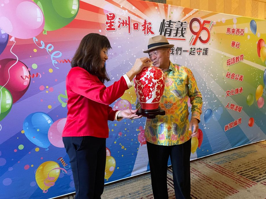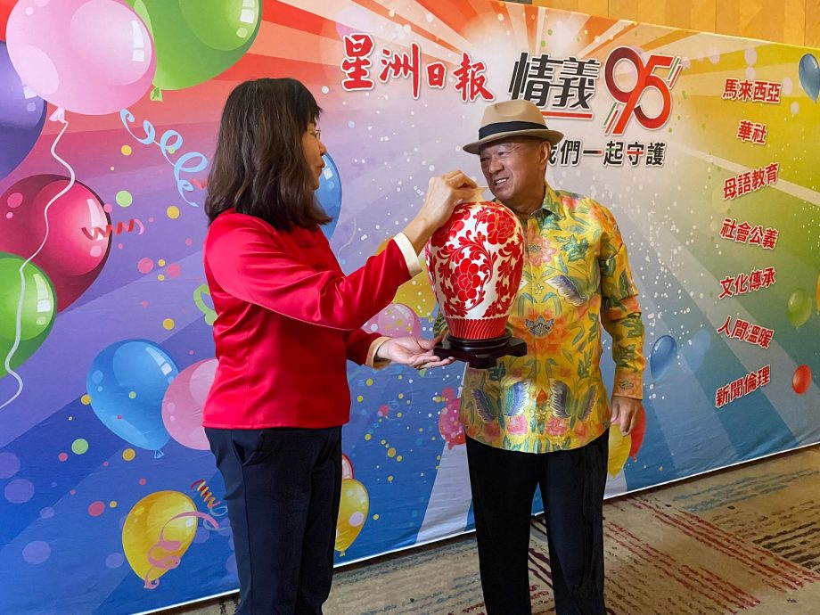李金友表示,此陶瓷花瓶是在中国特别定制,即有保平安之意,也是勉励星洲日报。“如果星洲是牡丹,那么马来西亚的华文教育、华校都是很重要的绿叶,责任重大。”