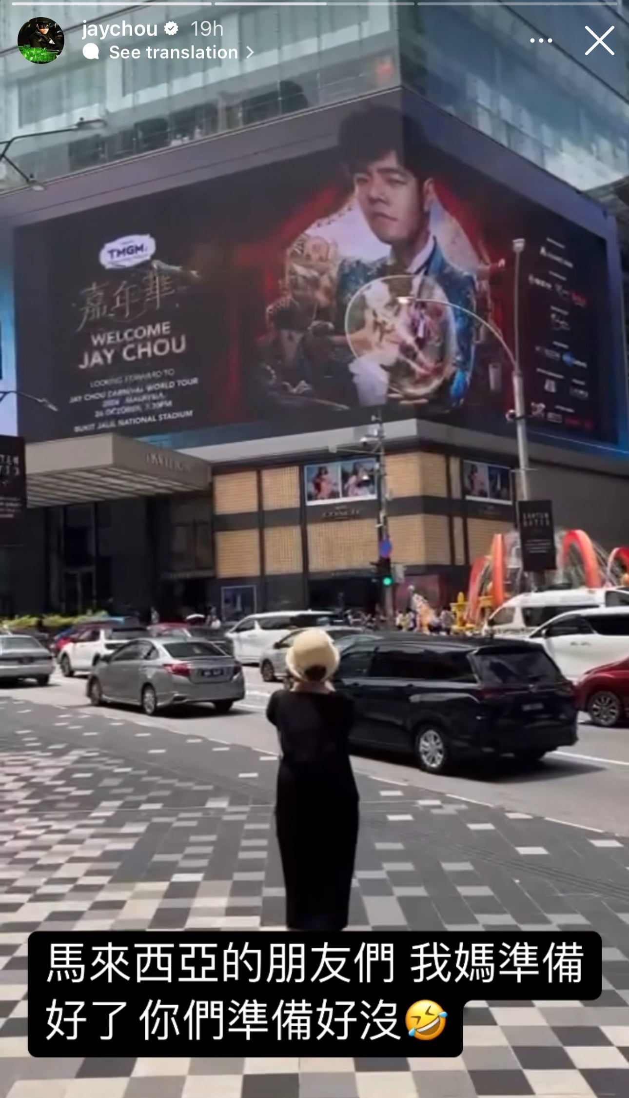 (吉隆坡26日讯)台湾天王周杰伦(周董)今晚“返场”大马开唱与香港天王刘德华“打对台”,一个在户外唱、一个在室内唱,相当热闹。周董昨日在IG限时动态分享妈妈叶惠美在吉隆坡柏威年广场外的3D屏幕看板打卡,笑说:“马来西亚的朋友们,我妈准备好了,你们准备好没”,还附上笑到飙泪的表情符号。