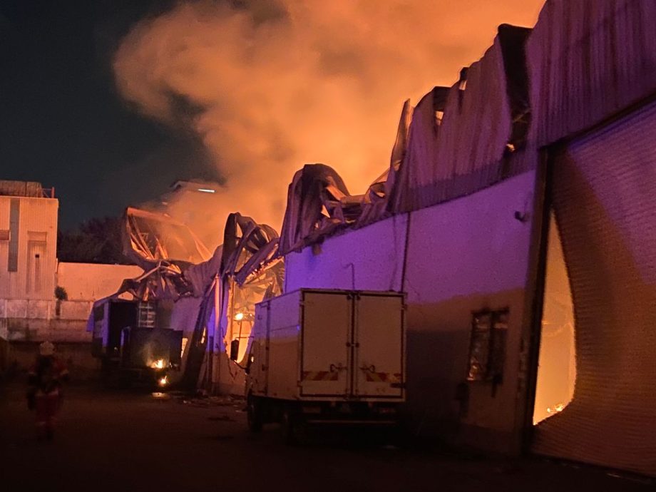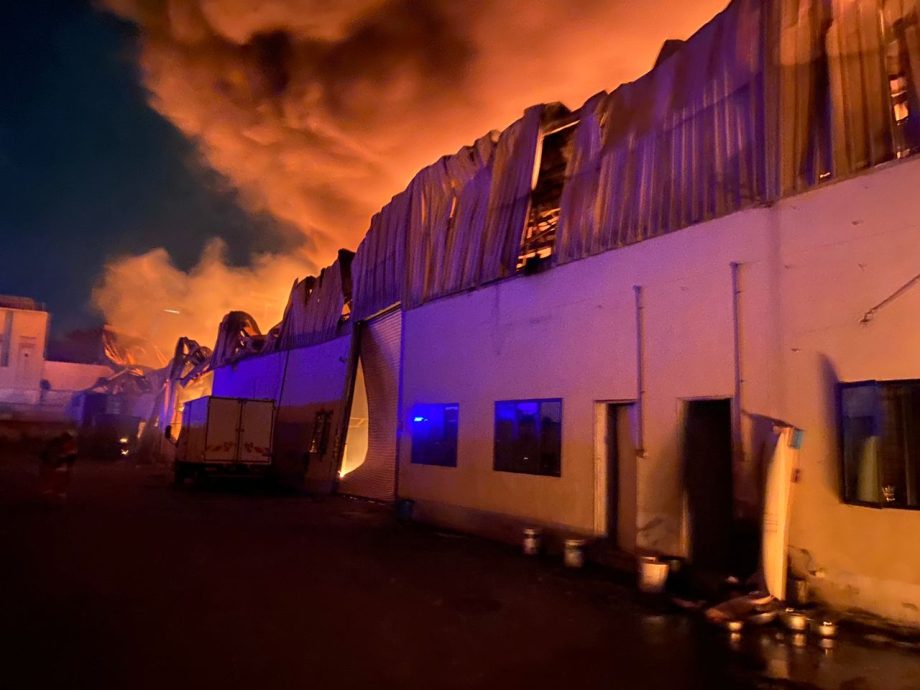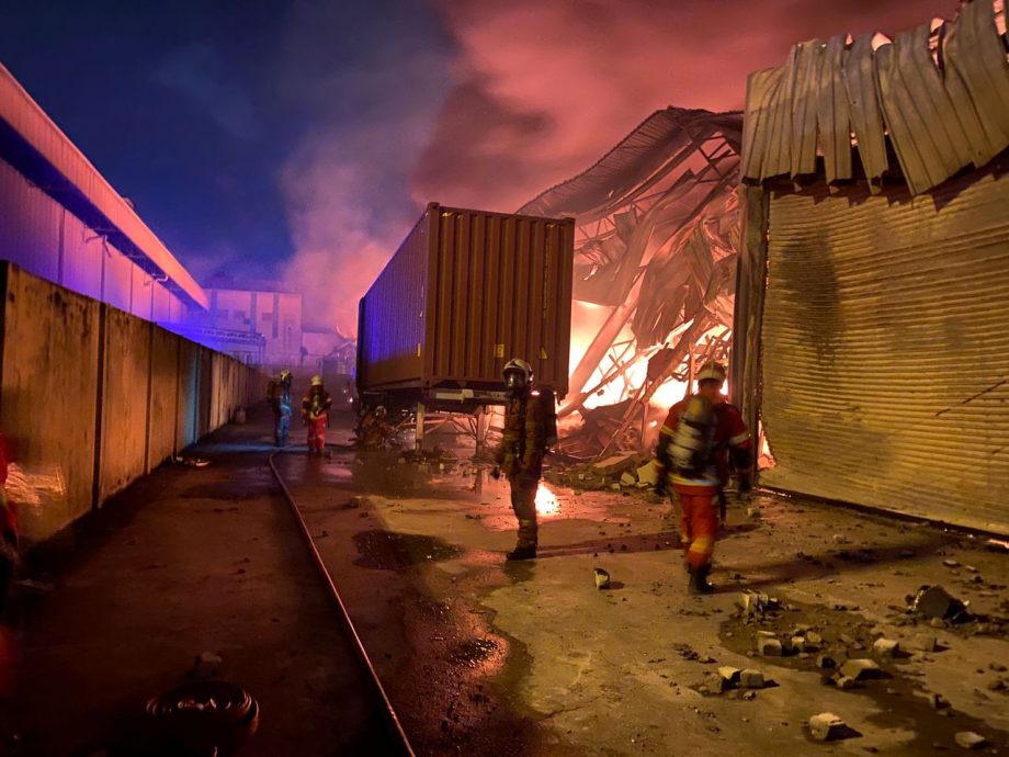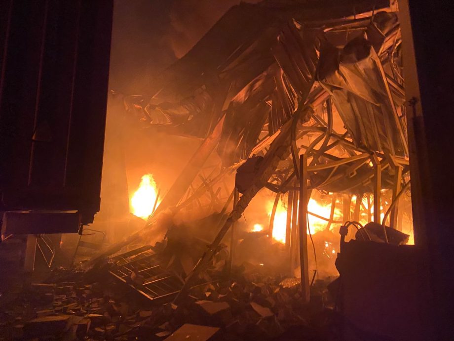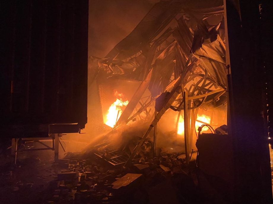 (八打灵再也31日讯)双溪毛糯一大型货仓于凌晨起火,因存放易燃轮胎和电池导致火势一发不可收拾至屋顶坍塌,经过一夜的灌救工作后,已成功防止大火蔓延至附近工厂。