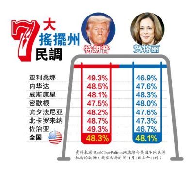 关于关键战场州的选情,知名国际政治学者杰里米·梅耶认为两位候选人势均力敌。“目前在7个战场州,选民支持率几乎平分秋色,”他说道,“这些州的选情极其接近,选民的极化现象非常明显。”