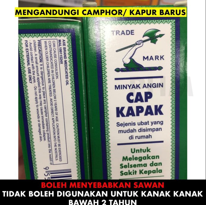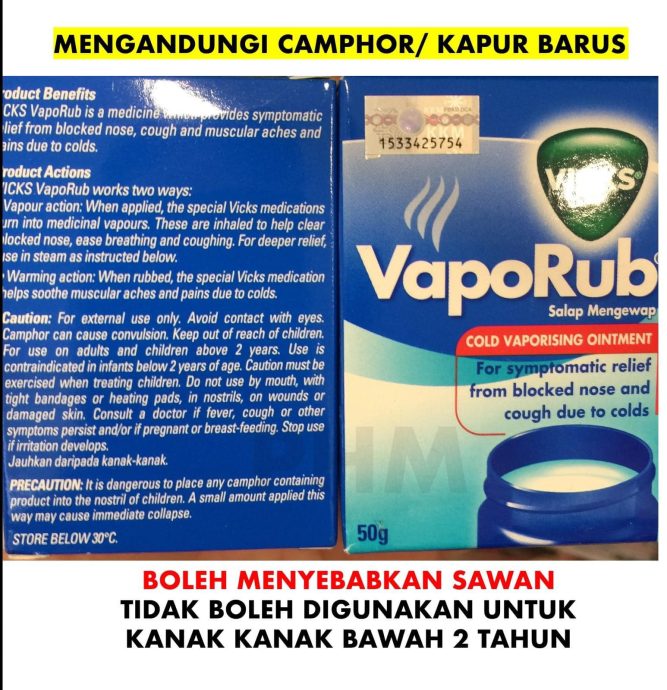 (八打灵再也1日讯)家长请注意,2岁以下幼童并不适用含有樟脑(camphor)的产品!