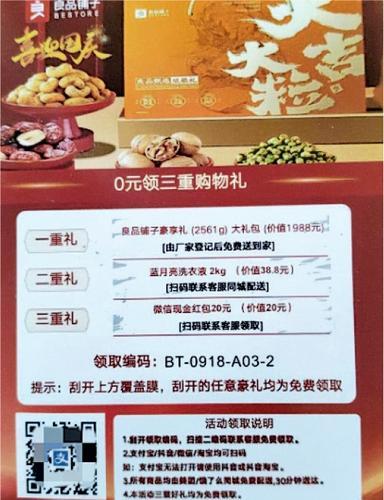 四川成都女子李某日前对《封面新闻》说,几天前收到速递件,拆开一看,里面只有一个信封,装了一封感谢信和一张刮刮卡。刮开显示奖品明细有良品铺子大礼包、其他品牌产品以及现金红包,卡片上标注礼品价值人民币上千元,想要获得奖品,须扫描二维码或联系客服。