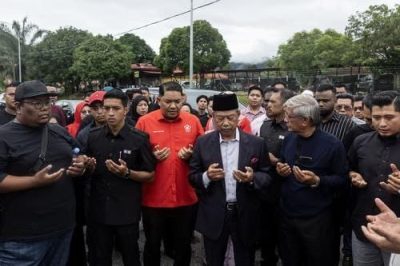 慕尤丁今早再度来到话望生法庭,在进入法庭之前,他与支持者在外面祈祷。