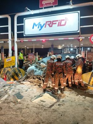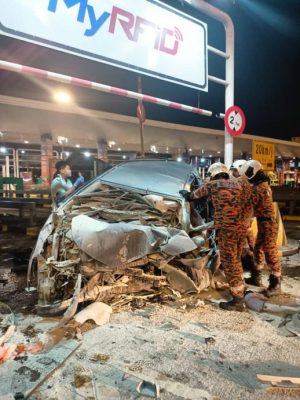 (八打灵再也5日讯)一辆轿车疑失控撞向大道收费站防撞褚墩,车内2名华裔男子当场被夹毙。