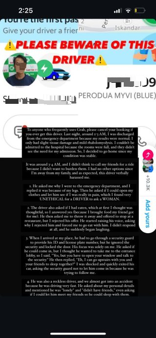 (八打灵再也6日讯)一名女子在社媒平台申诉她被电召车司机骚扰,并分享经历以警惕女性朋友们避开这名司机。