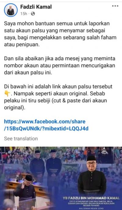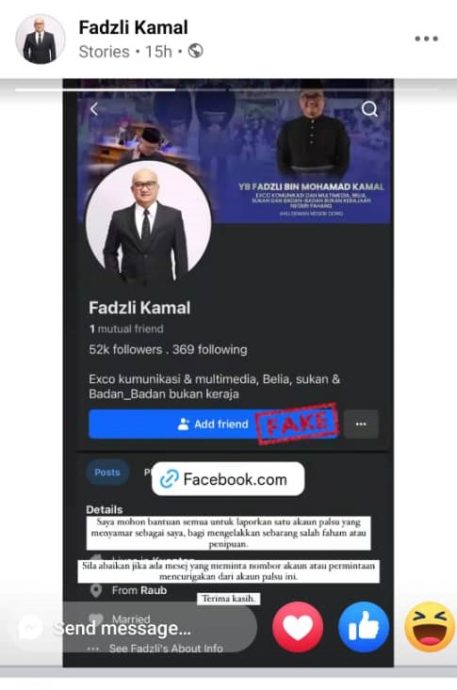 也是彭州通讯与多媒体、青年、体育与非政府组织委员会主席的法兹里莫哈末,在官方脸书发布通告,呼吁网民协助举报一个仿冒他的脸书假账号,以避免任何的误会或诈骗行为。
