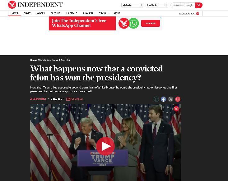 英国的《独立报》11月7日一篇报道中也称特朗普是第一位当选国家最高职位的“被定罪的重刑犯”。报道指,今年初,特朗普成为首位被定罪的美国前总统,创造历史,如今,在2024年大选,他又击败贺锦丽赢得漂亮一仗,再次创造历史:成为首位当选国家最高职位的“被定罪的重刑犯”