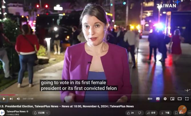 综合台湾《联合报》、中天新闻网和Now新闻报道,由公视经营的英语新闻频道“TaiwanPlus”近期就美国总统大选制作一系列专题报道,其中提到特朗普时,将他形容为“被定罪的重刑犯”(convicted felon)。