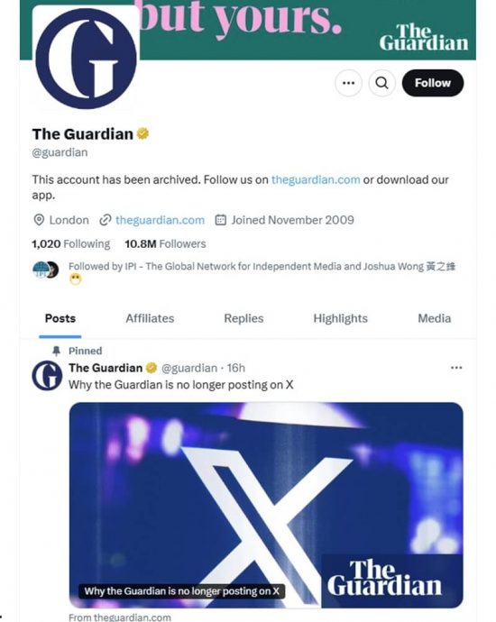 英国《卫报》在X平台上发布了“为何卫报不再在X平台上发文”的贴文不再更新。(图取自x.com/guardian)