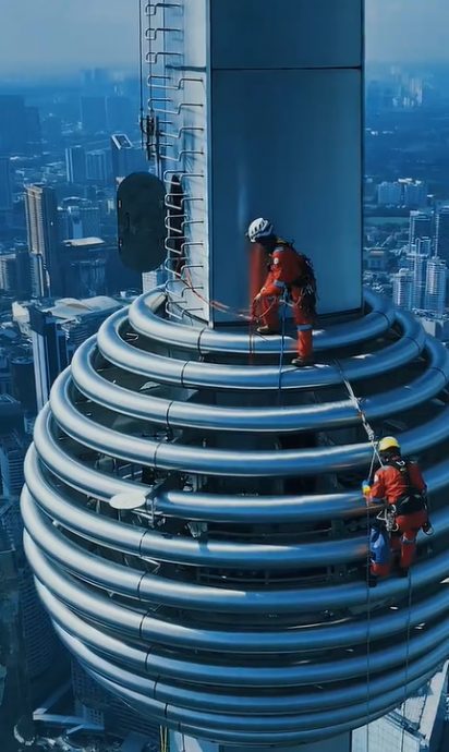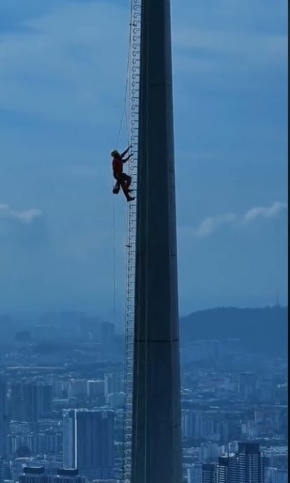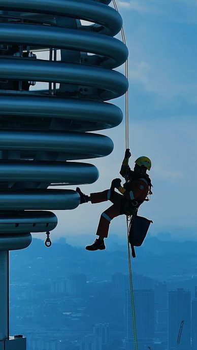 452公尺高的国油双峰塔有88层楼,想象在这个高度攀爬楼梯已令人胆寒,更何况得悬挂于高空展开工作!