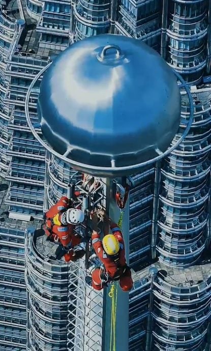 “勇敢的人儿攀上国油双峰塔塔尖工作,令人叹为观止的一幕!在海拔如此之高的地方工作所需的勇气和奉献精神,鼓舞了许多人。他们确保了我们标志性的天际线熠熠生辉,向这群英雄致敬!”