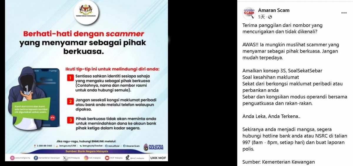 Amaran Scam也在贴文中附上“小心假冒执法部门的诈骗行为”资料。该资料来源是国家银行。