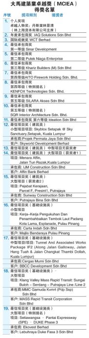 今年获得MCIEA表彰的三个重要项目包括位于吉隆坡敦拉萨路的艾芬大厦(Menara Affin)和布城第1区Parcel F政府办公楼,各别获得了“最佳项目奖”(建筑类别)。此外,巴生河流域捷运2号线即双溪毛糯-沙登-布城线 荣获“最佳项目奖”(基础设施类别)。