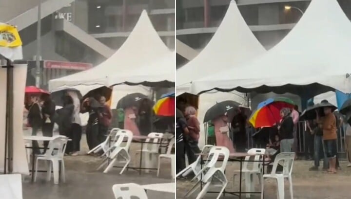 拍摄视频者不满表示,这些顾客为了品尝美食而甘愿冒雨,不如先回家,等天气晴朗再回来光顾。