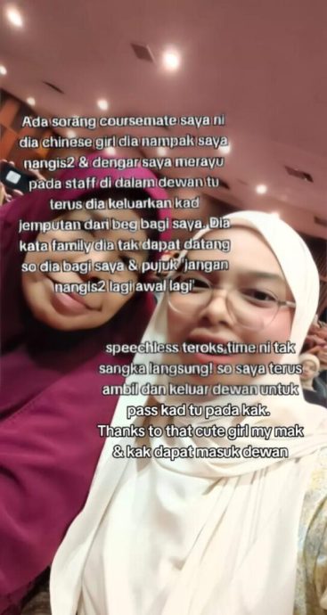 (亚罗士打19日讯)一名女子日前在社媒分享自己的毕业典礼一波三折的经历,先是家人没邀请函无法进场,接着自己没穿黑袜被挡在门外,幸好最后遇到好心人相助,引发网民热议。