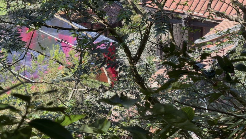 新竹南园,三面环山隐秘性高。从山坡边隐约看到婚宴会场,原本的空地已经搭起采光罩,下方拉起红色布幔,大红灯笼挂了好几串,具有中国风。