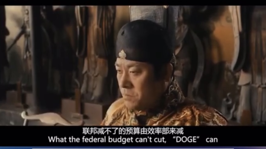 片中马斯克穿着明朝官服霸气登场,带着下属直闯“民主党总部”,宣称贺锦丽被“懂王”特朗普击败后,他领导的政府效率部(DOGE)就是来削减联邦预算的!