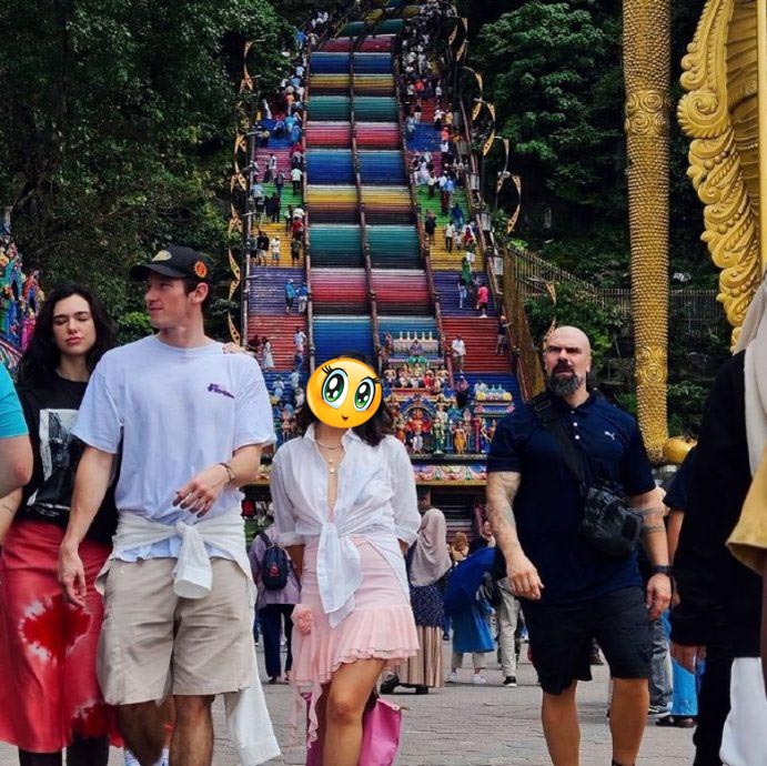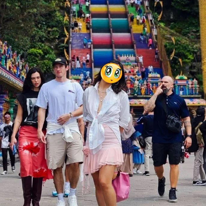 (吉隆坡28日讯)英国流行天后)于23日在大马举办一连两场演唱会,她趁演出空档到拍照打卡。近日有游客分享和黑风洞彩虹梯的合照,意外发现杜娃黎波和33岁英国男星男友)也入镜。