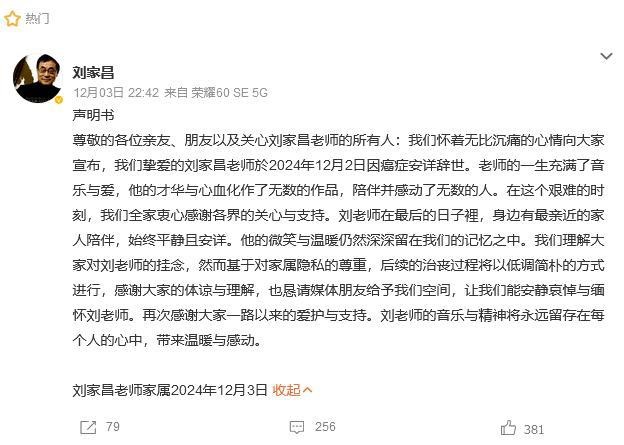 我们怀着无比沉痛的心情向大家宣布,我们挚爱的刘家昌老师于2024年12月2日因癌症安详辞世。