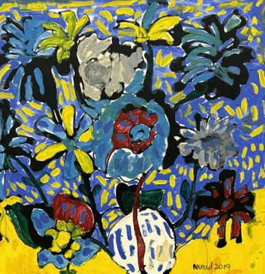 在展览中,有几幅作品让我印象深刻。一幅Jack Chin Wen Jie以细腻精致的钢笔描绘,一片寂静的乡村,光影交错间,透出一股平静安定的力量。另一幅Nurulakhmal Ab Rahman的“蓝色的花园”,则运用了红黄蓝三原色,表现出花卉在阳光下绽放,充满了向阳花开的活力与希望。还有一幅Yuri Azzari的“婆婆的家”,画中窗外的树木与窗内的摇椅相映成趣,仿佛在述说人与自然的密切关系。这些作品,无论形式如何,都展现了艺术家们对生命的热爱以及对和平的向往。