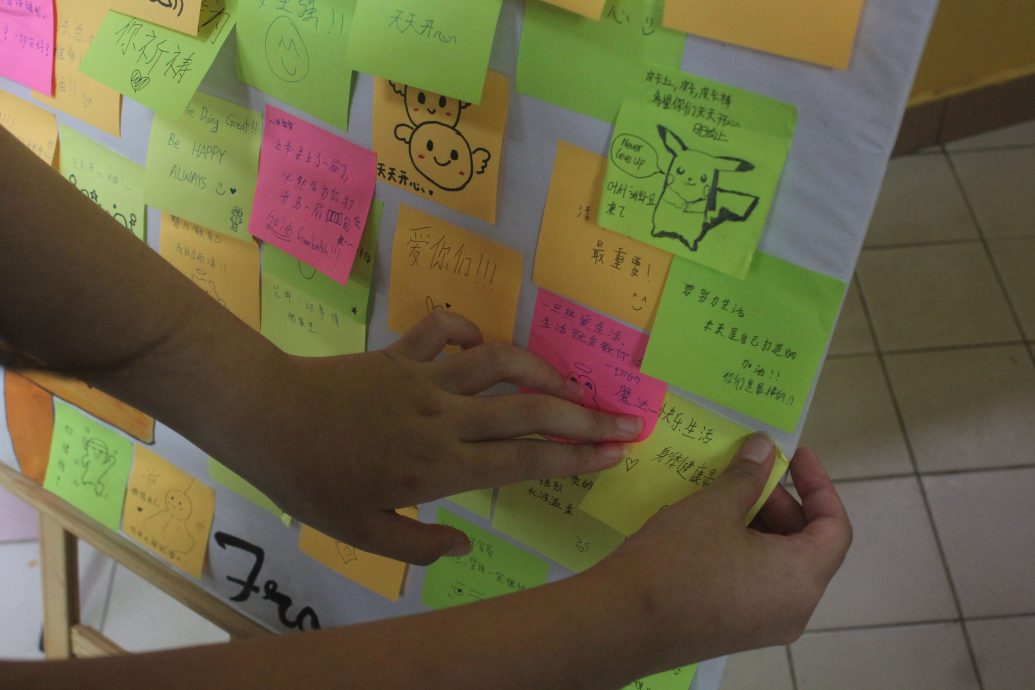 例如挑战者体验不能用手穿衣的不便,旨在引发大家对弱势残障人士的关注和理解。同时,我们还将写有北大生祝福语的留言墙带给童乐院的人,让他们感受到人间有爱。”内务副主席官佳莹说道。