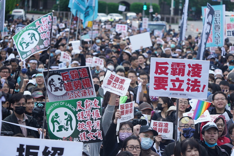 (台北7日综合电)台湾周六举行“反霸凌,护劳权”大游行,向民进党政府传递“陈情书”,传达制定反霸凌专法、警消筹组工会、立法保护吹哨者等三大诉求。