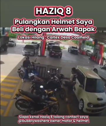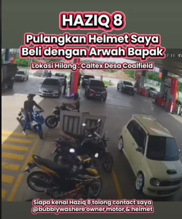 (八打灵再也7日讯)每个人几乎拥有一些具有纪念价值且用钱也买不到的物品,一旦失去就感觉好像魂也丢了一半似的。最近,一名女孩急寻“Haziq 8”男子,因为对方在双溪毛糯Desa Coalfield加德士油站拿走了一辆摩托车上的头盔,那是已故父亲陪她一起购买的礼物。