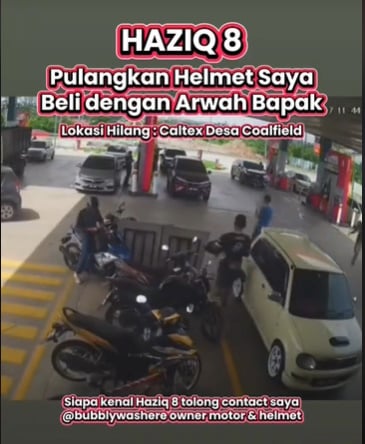 “Haziq 8”的偷窃行为被加油站的闭路电视录了下来,视频中,只见他从加油站的便利店走出时,顺手取走一顶放在一辆摩托车的头盔,再装模作样放在自己的摩托车,然后戴起自己的头盔,骑着摩托离开现场。