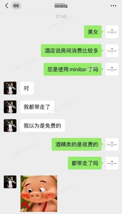 根据酒店员工提供的对话记录,女子坦言自己以为迷你吧台的饮料是免费的,因此全部带走,其中包括几瓶价值上千元的酒。当酒店表示将额外扣款时,她无奈接受,却仍坚称“不知情”。