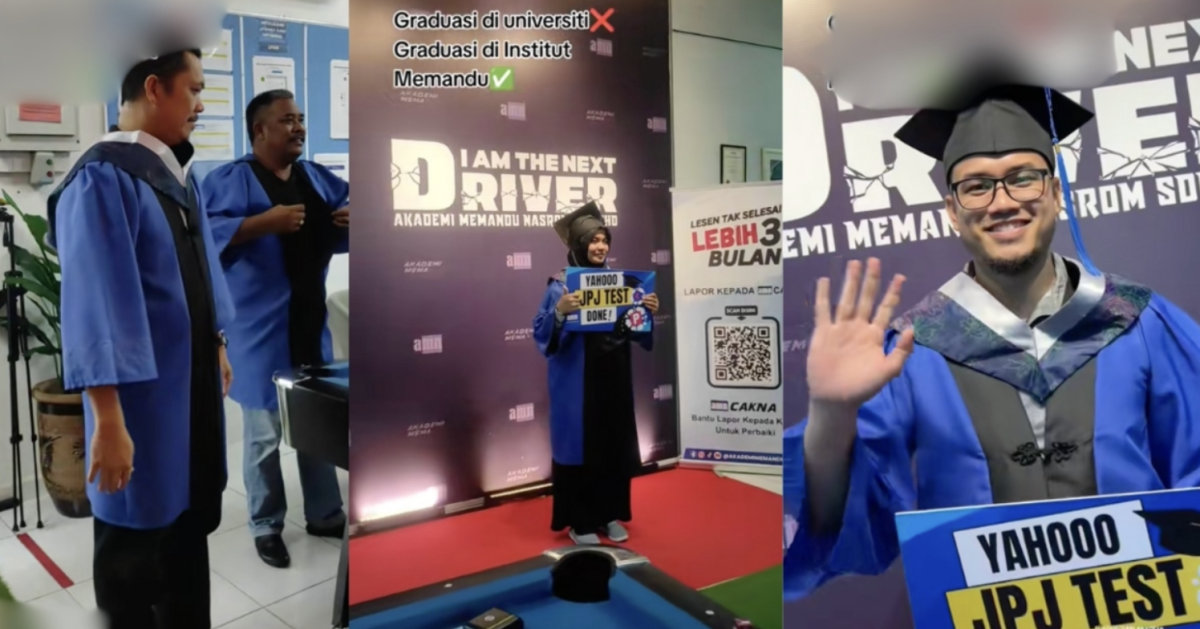 视频中,多名学生穿着毕业袍、戴着四方帽,手持“耶!我通过JPJ测试”的标语,站在印有“我是下一个司机”的站牌前拍照留念,气氛欢乐又热烈。
