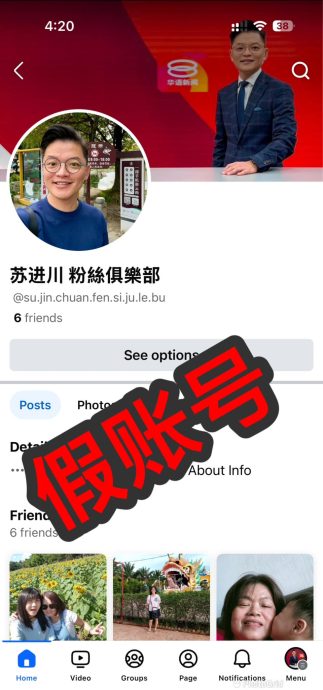 他在脸书解释,他目前只有一个拥有4万6000个追随者的脸书专页,叫“苏进川新闻主播”,并未创建任何粉丝俱乐部或其他个人账号。