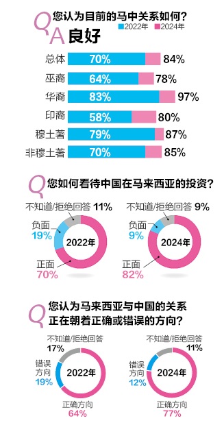根据民调结果,77%受访者对中国持正面看法,84%受访者认为马中关系发展良好,与2022年的38%和70%相比,分别增长一倍多和14%。
