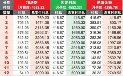 而所谓的78法则,其实是衍生于这种固定利率的产品,他主要的目的就是让大家提早还款时会更吃亏,因为如果按照上述的算法,利息一年RM 2,000的话,那么每个月就大约RM166.66左右,我提早一年还款应该可以省略RM 2,000的利息吧?