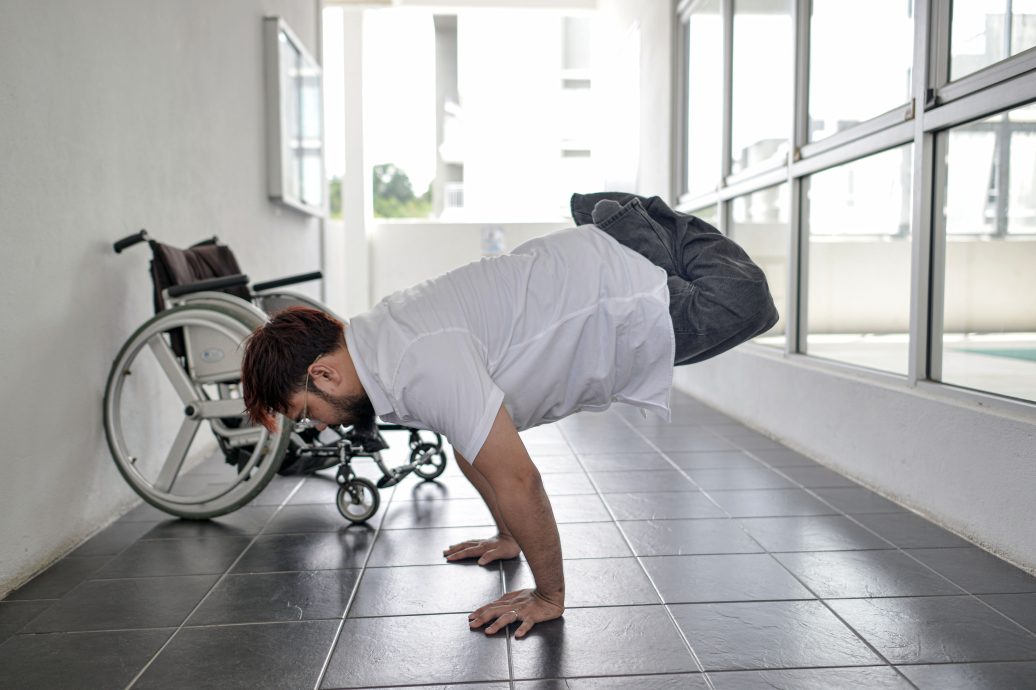 阿兹鲁汗被诊断为脊髓神经损伤,双腿瘫痪,靠爬行行动,完全依赖手部力量。