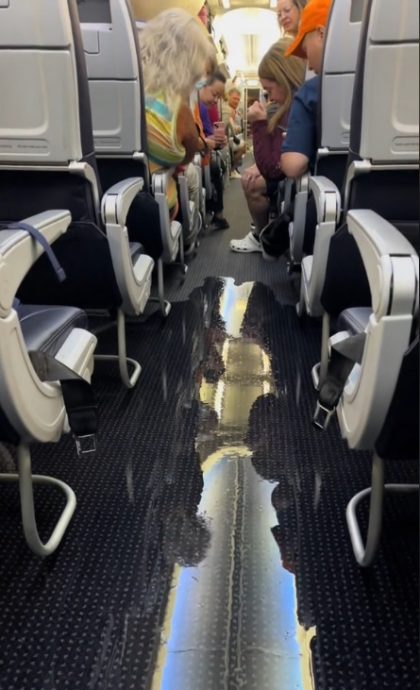 纽约邮报报导,一名乘客将机舱淹水的画面上传TikTok,至今获得超过720万次点阅。影片显示,机舱后面厕所忽然漏水,水沿着走道向前流到机舱前段,一些乘客纷纷走避远离积水。