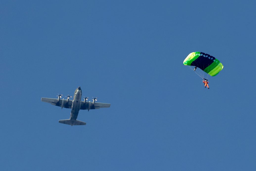 美国总统拜登授权国务卿,向台湾提供的军事援助调拨高达5.713亿美元。图为12月20 日在屏东举行的实战训练找那个,一名台湾伞兵从 C-130 运输机上跃下。(欧新社照片)