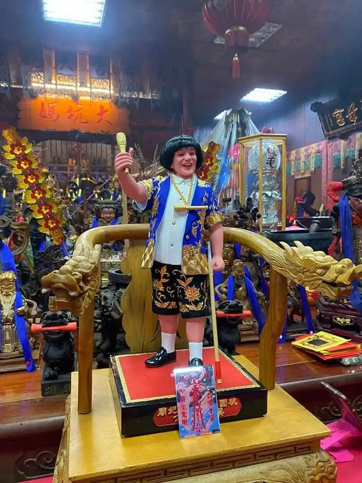 根据分享的照片,这尊神像有着经典的“马桶盖头”,身穿西装短裤、白短袜配黑皮鞋,右手还拿着金色麦克风,外形酷似有“秀场天王”之称的猪哥亮本人。