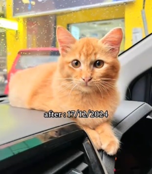接着画面切换到今年12月17日的镜头,看到同一只小猫,如今已变成一只活泼健康的大猫,趴在救命恩人轿车的仪表盘上。