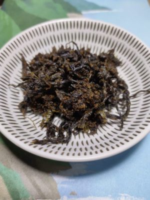 Masak lemak cili padi是汤菜,嫩木薯叶仁当则完全不带酱汁,也完全看不出木薯叶的样子,叶子干干黑黑,蜷缩成螺旋状,乍看还以为是普洱散茶或梅菜干,吃起来有点酥脆,辛辣惹味中带点甘苦,是一道极具个性的小菜!