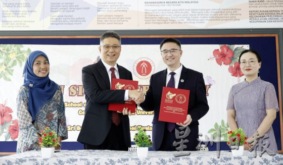 吉隆坡Sri Bestari私立学校与中国华中师范大学签署“云上中文”合作备忘录。左二起为Sri Bestari私立学校校长史蒂文博士、华中师范大学文学院副院长余一骄教授,以及华中师范大学国际文化交流学院教授万莹。