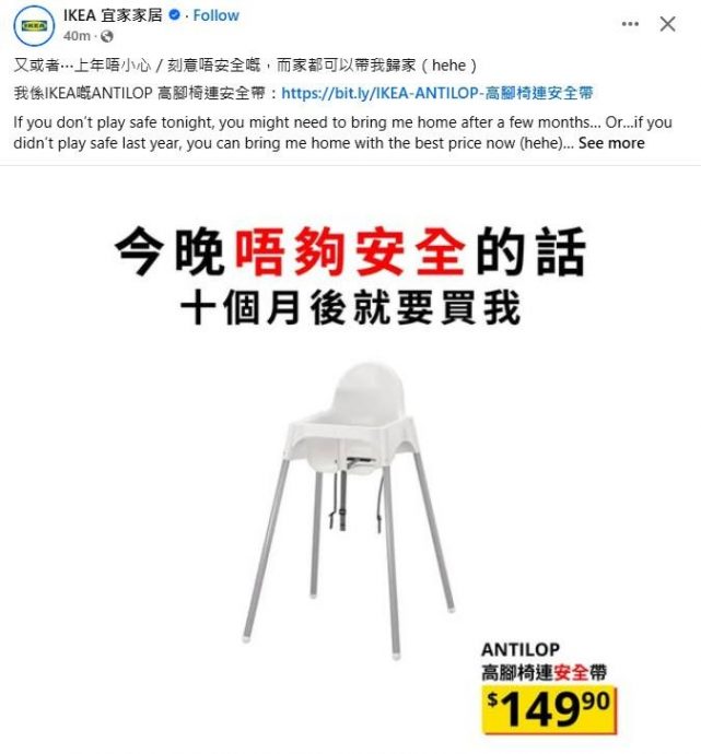 (香港25日讯)香港宜家(IKEA)推销婴儿椅的创意文案语带双关,提醒消费者在平安夜做好“安全”措施,逗趣内容让网民捧腹。