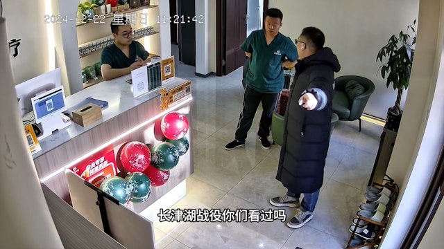 闭路电视的拍摄时间是本年12月22日,内容显示有一名老板到一家提供医疗服务的店里视察,指手划脚地教训员工。