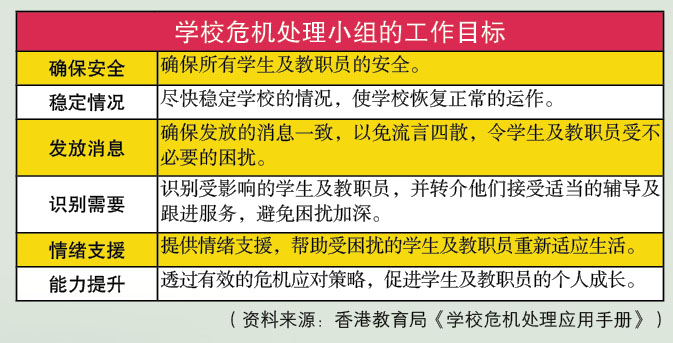 万一学校真的发生危机事件,危机团队的责任是统筹和协调校内外资源,再按情况调动人手。