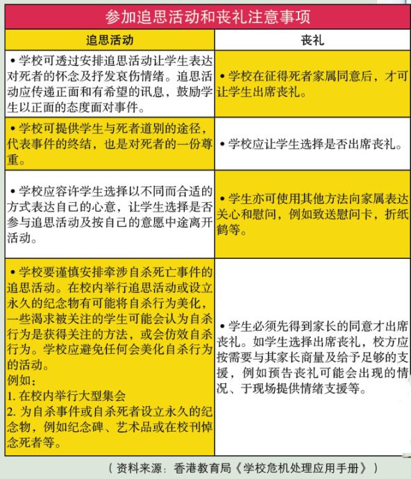 通常,校方会根据学生受影响的程度来决定采取哪种措施,例如提供团体或一对一辅导。如果是团体辅导,王韵畅说,理想情况是由心理健康专家或有经验的人来主持,最重要是给这些学生有发言的机会,让他们倾诉对事件的想法与感受(但还是那句——如果他们不想讲就别强迫他们)。假如过了一段时间,这些学生依然备受情绪困扰,校方就应该评估有没有需要提供进一步支援。