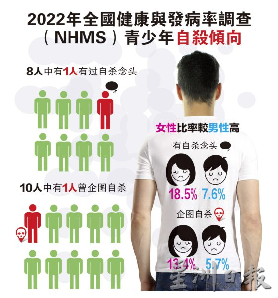 根据卫生部2022年全国健康与发病率调查报告,我国每4位青少年中,有1位有忧郁症状;每8位中有1位有自杀念头;每10位中有1位曾企图自杀(右图)。学校到底要怎样知道谁有自杀念头?彭开贤说:“这就很靠学校平时的工作了。”