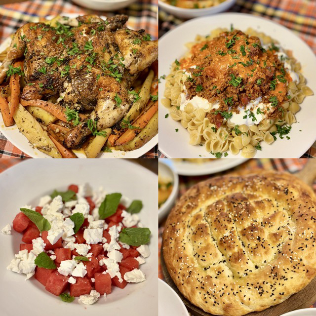 主菜是烤鸡。从伊斯坦布尔买回了一款叫做“Isot”的辛香料,那是土耳其南部的一种特色红辣椒,也称作“Urfa”。红辣椒晒干后研磨成粉,颜色呈深红至紫色,口感微辣,带有甘甜和烟熏的风味,很适合用来烤肉。将红葱切丝,挤入柠檬汁,再加上在伊斯坦布尔买的“Sumac”漆树粉,就是一道酸咸适当又解油腻的配菜,适合搭配肥美多汁的烤鸡。