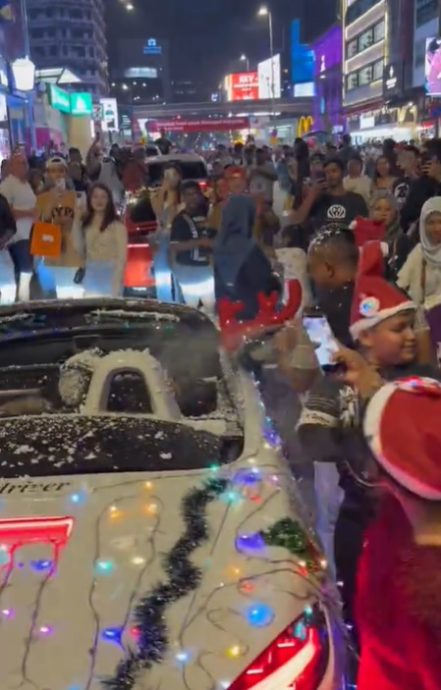 网民阿沙菲在圣诞之夜就亲眼目睹该辆被跑马灯装饰的跑车司机,被现场参与派对的民众狂喷雪花,不仅喷得司机满身,而其敞篷跑车也被喷满雪花。