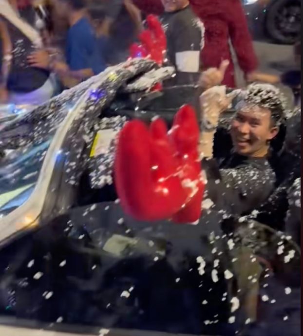 (八打灵再也27日讯)常见民众狂,尤其是在吉隆坡黄金三角一带,然而一名敞篷跑车司机和女伴被路人狂喷雪花时却没有生气,反而开心地与众人互动,引起关注。
