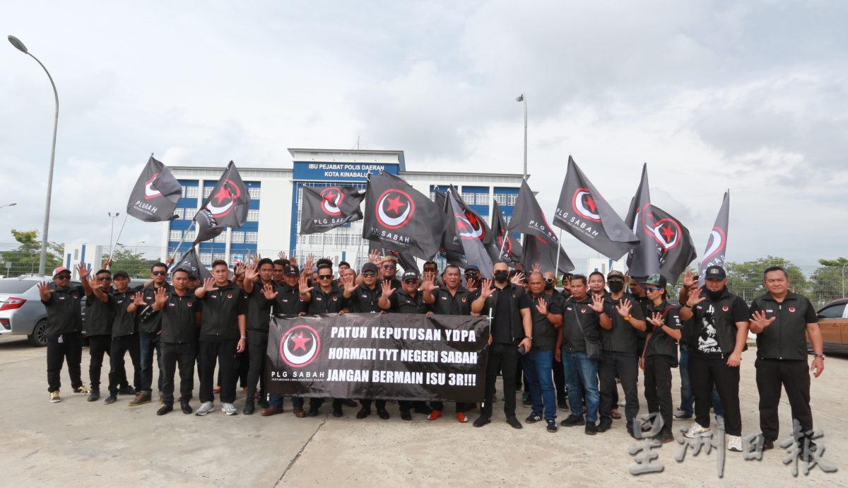 PLG沙巴州秘书莫哈末萨立占今午前往亚庇警局报案,随后与近70名会员在警局外高举横幅,提醒法米惹扎要尊重国家元首的决定、尊重州元首,以及避免发表涉及3R课题(种族、宗教和王室)的言论。