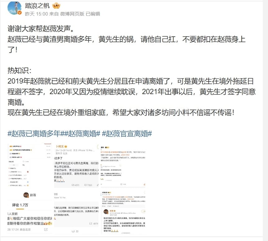 电影博主“踏浪之帆”爆料,黄有龙出轨对象是女儿的家教,赵薇2019年知道后就已经在走离婚程序,但因为黄有龙持有新加坡永久居留证,赵薇属中国籍,因此跨国离婚手续繁复,更指男方不断拖延不想签字,直至2021年赵薇突然遭列为劣迹艺人,才终于完成离婚手续。还有人爆料指出,黄有龙目前已结了第三次婚扶正小三。